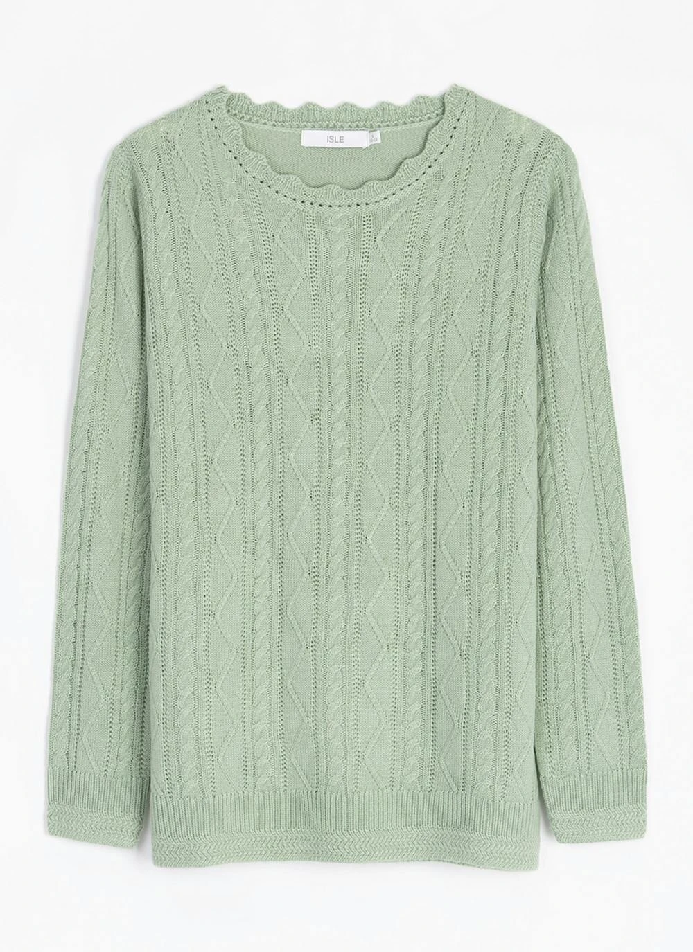 This crew neck jumper by Isle is perfect for layering. Designed in a regular fit with an all over cable knit pattern and a pretty scallop trim around the neckline. Make sure to wear this jumper with your favourite jeans or jeggings for a casual look.