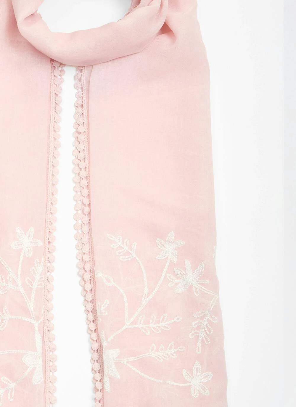 Add a feminine touch to your outfit with this lightweight scarf featuring pretty floral embroidery and crochet edging.