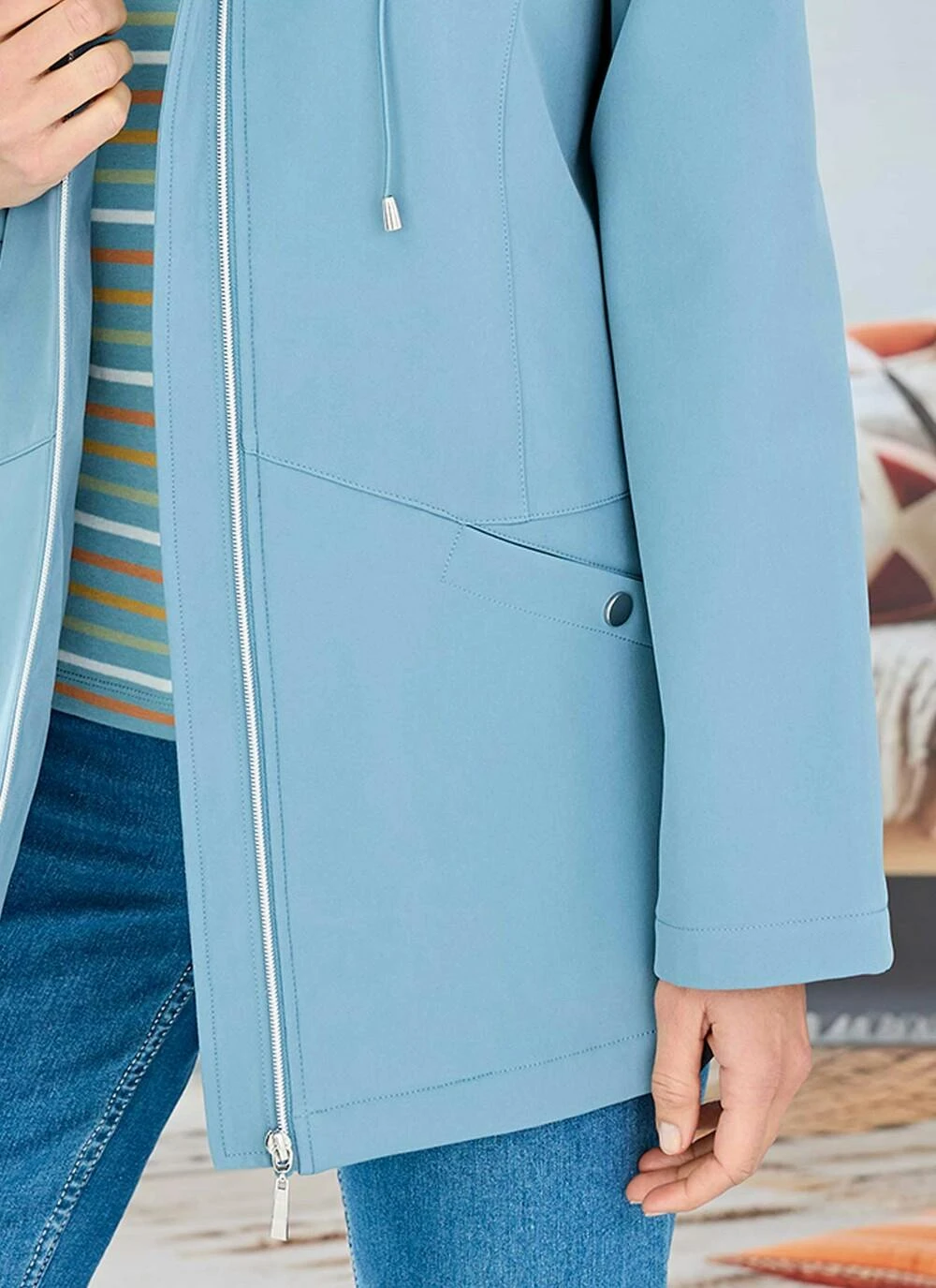 Modern summer jacket with stylish hi shine trims, zip pull and hood toggles. Practical pockets paired for a comfortable and flattering fit. A great buy for the new season.