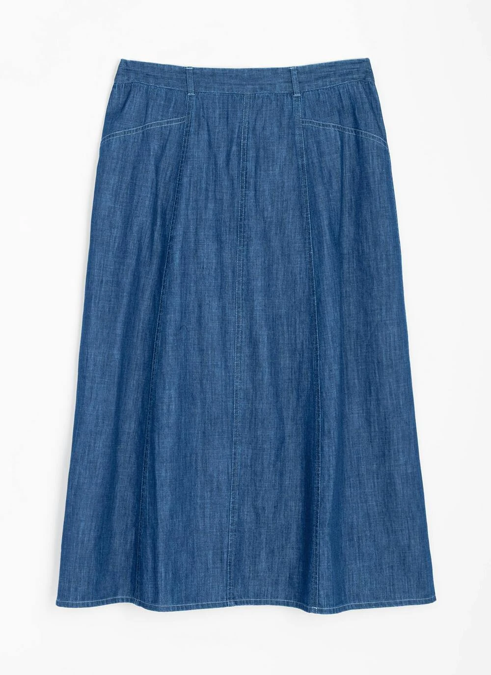 Classic, comfortable, and endlessly versatile—the Pure Cotton Denim Midi Skirt is a wardrobe essential with timeless appeal. Cut from durable yet soft cotton denim, this mid-length skirt features a flattering A-line silhouette, front seam detailing, and practical pockets. The clean finish makes it perfect for styling up or down, from countryside strolls to casual Fridays.