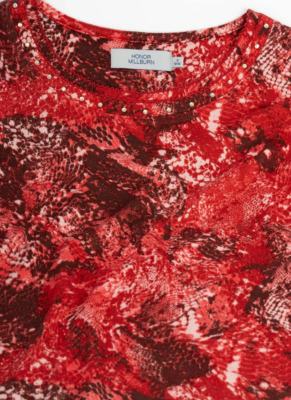 Top with 3/4 length sleeves in an attractive and modern print and warm touch, brushed jersey fabric. Featuring a heatseal design for feminine styling. Team with Honor Millburn Collection trousers and skirts to refresh your seasonal wardrobe.