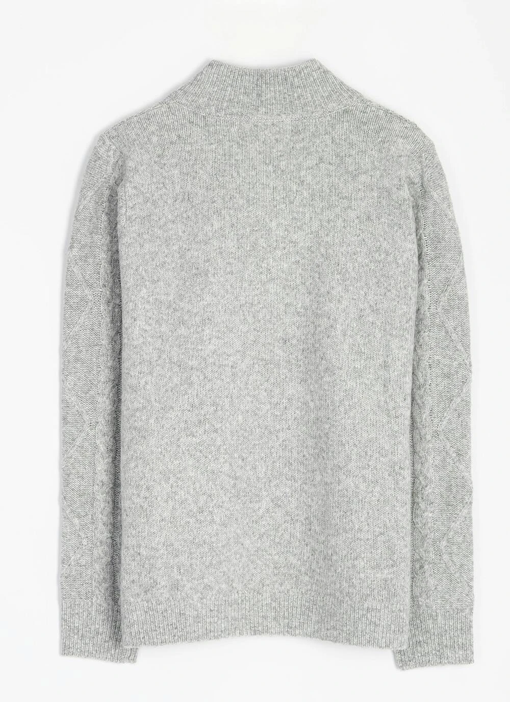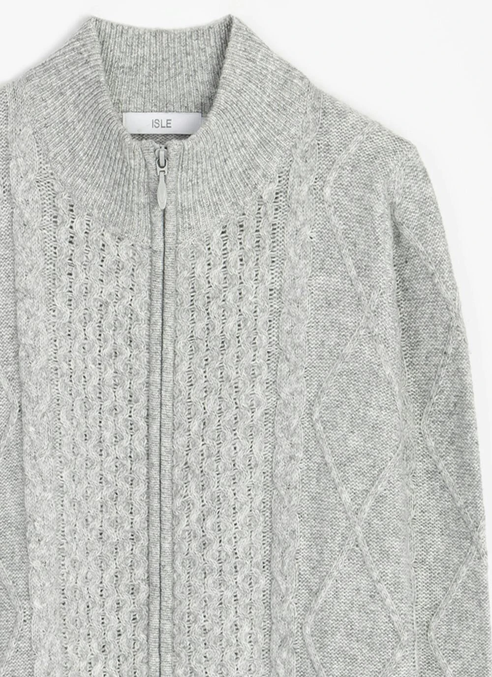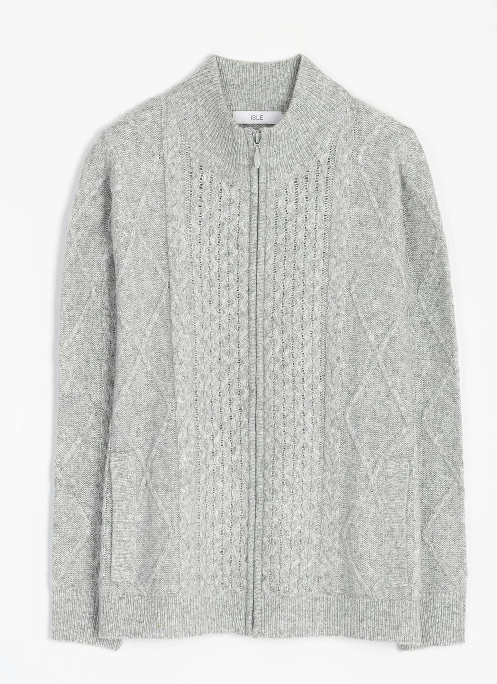This wool blend cardigan by Isle is perfect for layering over your favourite top this season. Designed with a front zip fastening, a cosy funnel neck and pockets for your convenience. Finished with a textured cable design for added interest.